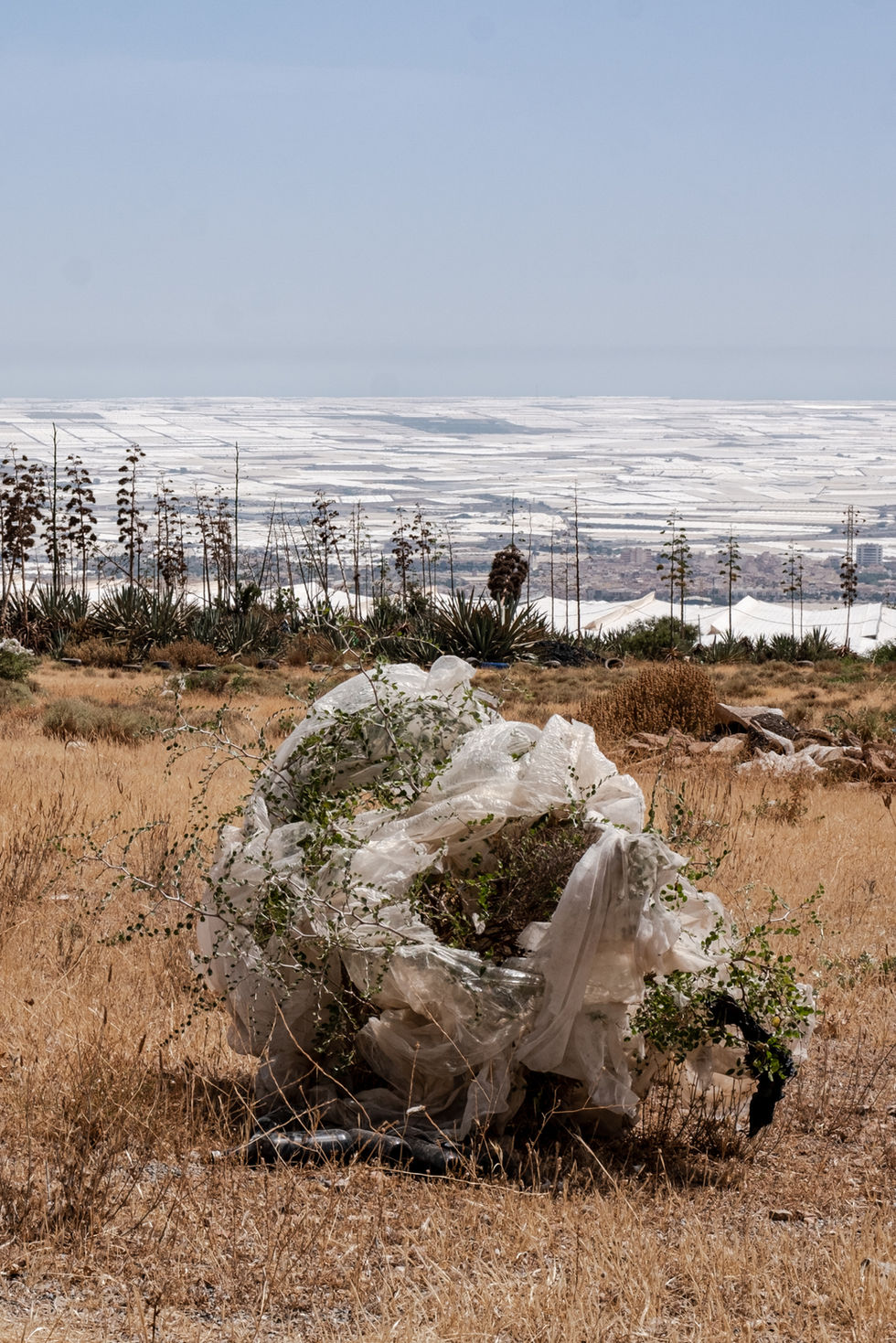 Dans ce paysage lunaire, je collecte des déchets plastiques pour composer des natures mortes à l'esthétique douce et minimaliste. Baignées par la lumière chaude de l'été andalou, ces images abordent la question plus sombre de la dégradation des résidus exposés au soleil et battus par les vents. Quel impact cela a-t-il réellement sur le sol et sur les produits cultivés ?